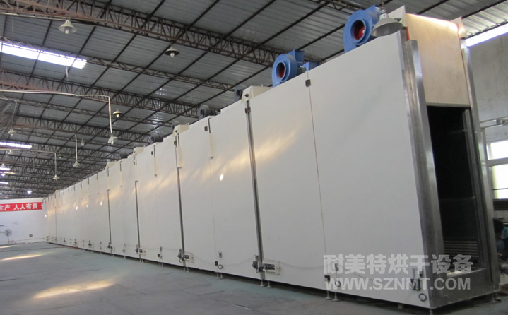 箱體內(nèi)膽尺寸:寬0.9米*高2.9米*長40米; 箱體共分為10段,每段長度=4米,其中預(yù)熱2段,烘干4段,程序降溫3段,強(qiáng)制冷卻1段;